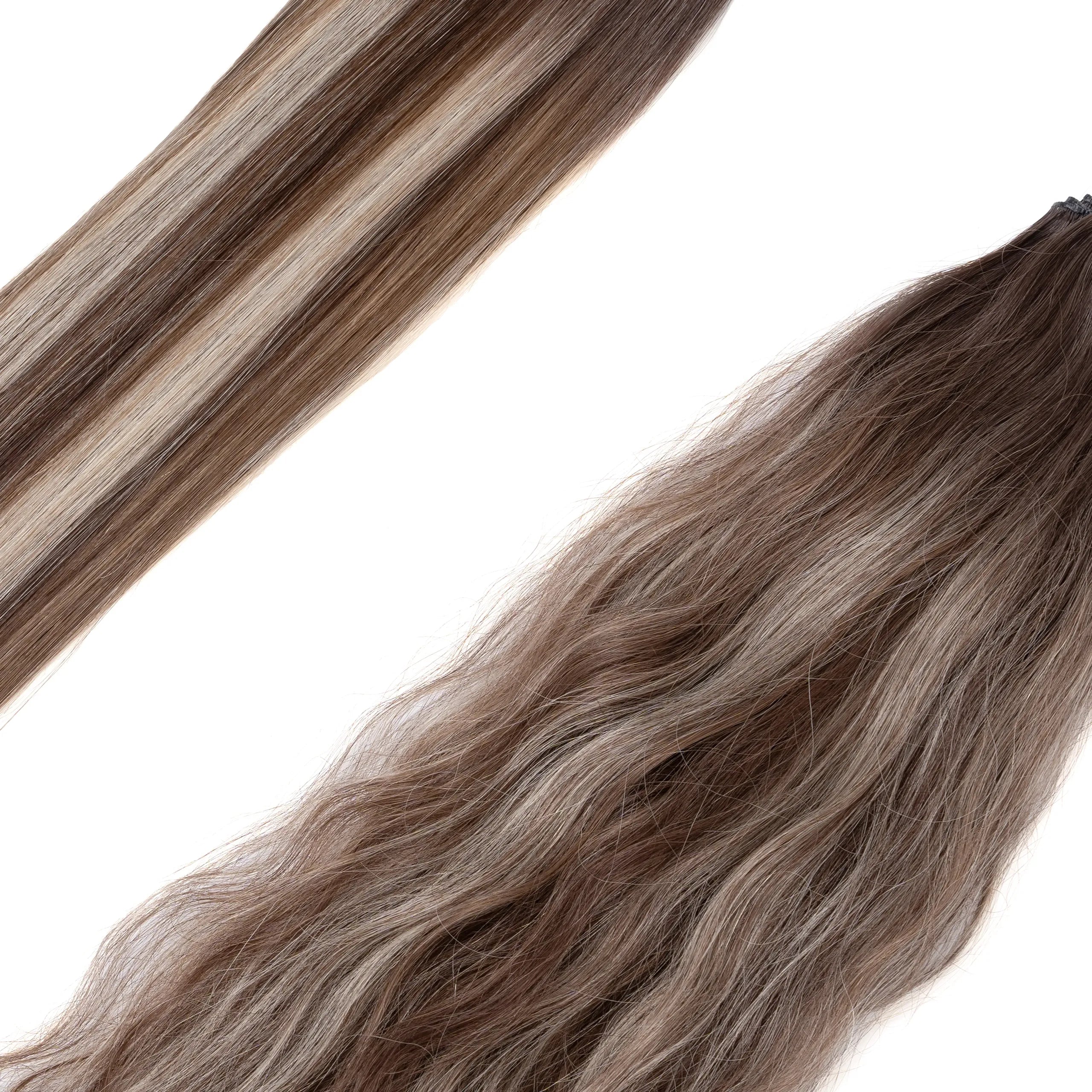 Taffeta features a rich level 4 root that transitions into a stunning tri-tone balayage effect, blending cool-toned bronde with pops of bright blonde and rich lowlights. This mix creates striking contrast, adding dimension and depth to hair. The cool tones of Taffeta complement natural hair colors ranging from dark to medium tones and works beautifully with cool or neutral skin tones. Taffeta's blend of tones provides depth and dynamic visual interest.